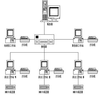 系統(tǒng)由IC卡閱讀器、工作站、服務器、打印機、相應網(wǎng)絡及管理軟件組成。由工作站接收IC卡閱讀器的客戶數(shù)據(jù)并輸入消費業(yè)務數(shù)據(jù),通過網(wǎng)絡保存到服務器。