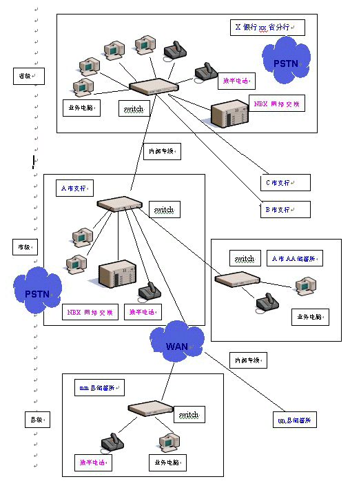 在銀行的省、市級(jí)分行分別部署一臺(tái)NBX網(wǎng)絡(luò)交換機(jī)——只需通過(guò)接入銀行系統(tǒng)內(nèi)部局域網(wǎng),經(jīng)過(guò)簡(jiǎn)單的配置即可使用。然后根據(jù)需要,在市內(nèi)各個(gè)儲(chǔ)蓄所、各縣級(jí)儲(chǔ)蓄所配置相應(yīng)數(shù)量的數(shù)字話機(jī),那么在全省內(nèi)各個(gè)縣市區(qū)的各個(gè)營(yíng)業(yè)網(wǎng)點(diǎn)之間,上下級(jí)之間就都可以使用數(shù)字電話機(jī)通過(guò)數(shù)據(jù)網(wǎng)免費(fèi)撥打語(yǔ)音電話。