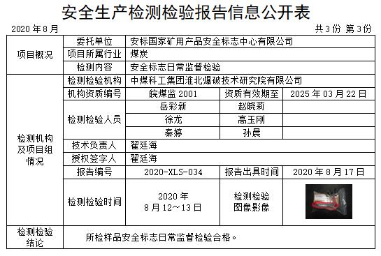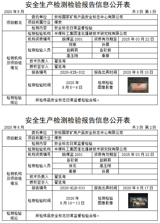 安全生產檢測檢驗報告信息公開表(2020年8月)