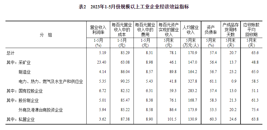 5月末,規(guī)模以上工業(yè)企業(yè)每百元資產(chǎn)實(shí)現(xiàn)的營(yíng)業(yè)收入為78.1元,同比減少5.8元;人均營(yíng)業(yè)收入為170.9萬(wàn)元,同比增加5.8萬(wàn)元;產(chǎn)成品存貨周轉(zhuǎn)天數(shù)為20.7天,同比增加1.0天;應(yīng)收賬款平均回收期為63.6天,同比增加6.4天。