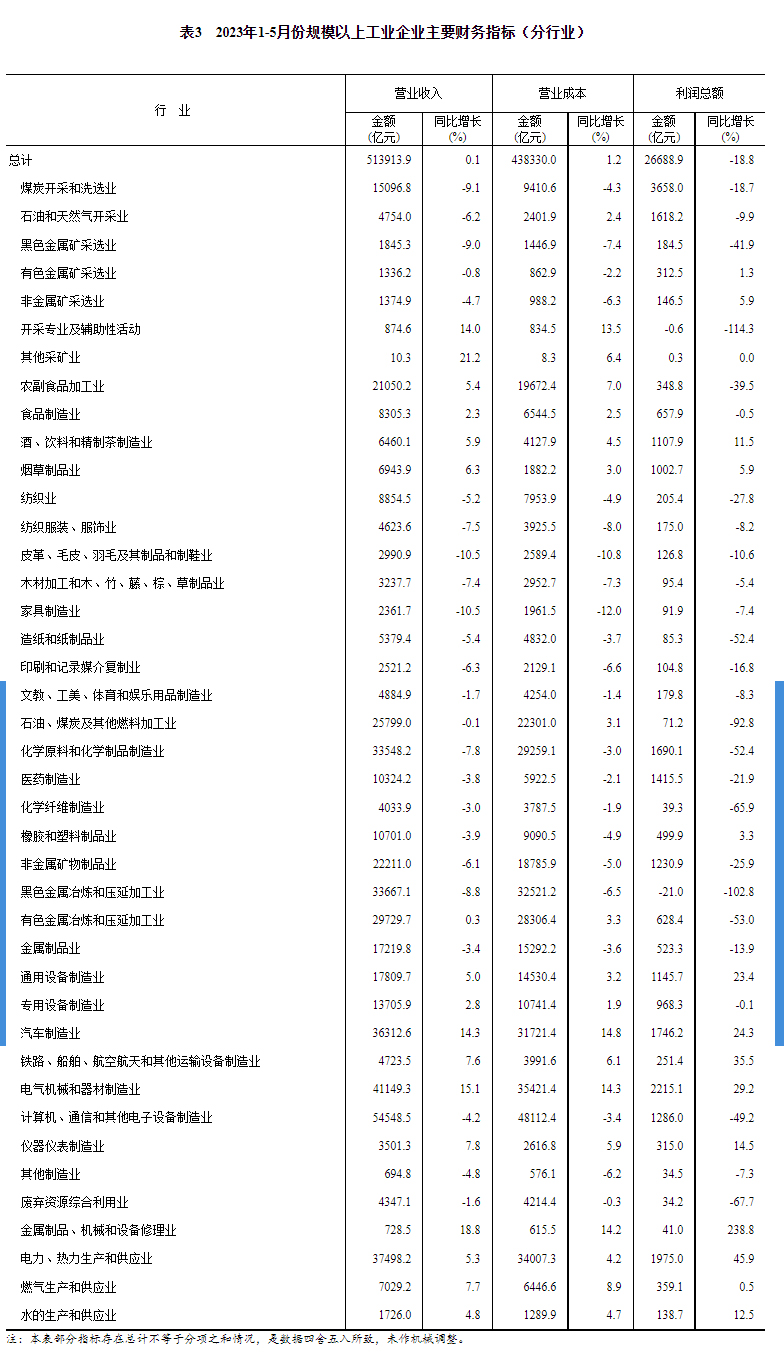 1—5月份,全國(guó)規(guī)模以上工業(yè)企業(yè)實(shí)現(xiàn)利潤(rùn)總額26688.9億元,同比下降18.8%,降幅比1—4月份收窄1.8個(gè)百分點(diǎn)(按可比口徑計(jì)算,詳見(jiàn)附注二)。