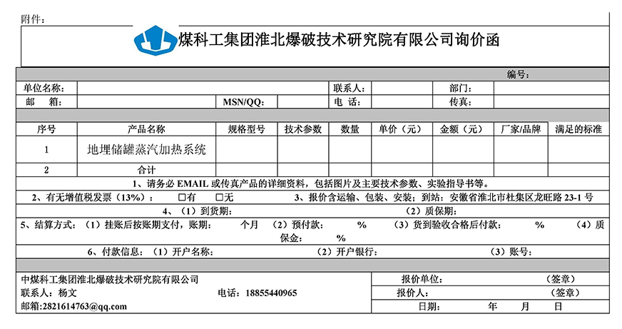 茲有中煤科工集團(tuán)淮北爆破技術(shù)研究院有限公司科達(dá)分公司地埋儲罐蒸汽加熱系統(tǒng)采購項目需進(jìn)行物資采購活動,現(xiàn)就儲罐蒸汽加熱系統(tǒng)采購進(jìn)行公開詢價采購,請意向報價單位通過響應(yīng)報價函(附件)書面形式進(jìn)行報價,感謝積極支持!