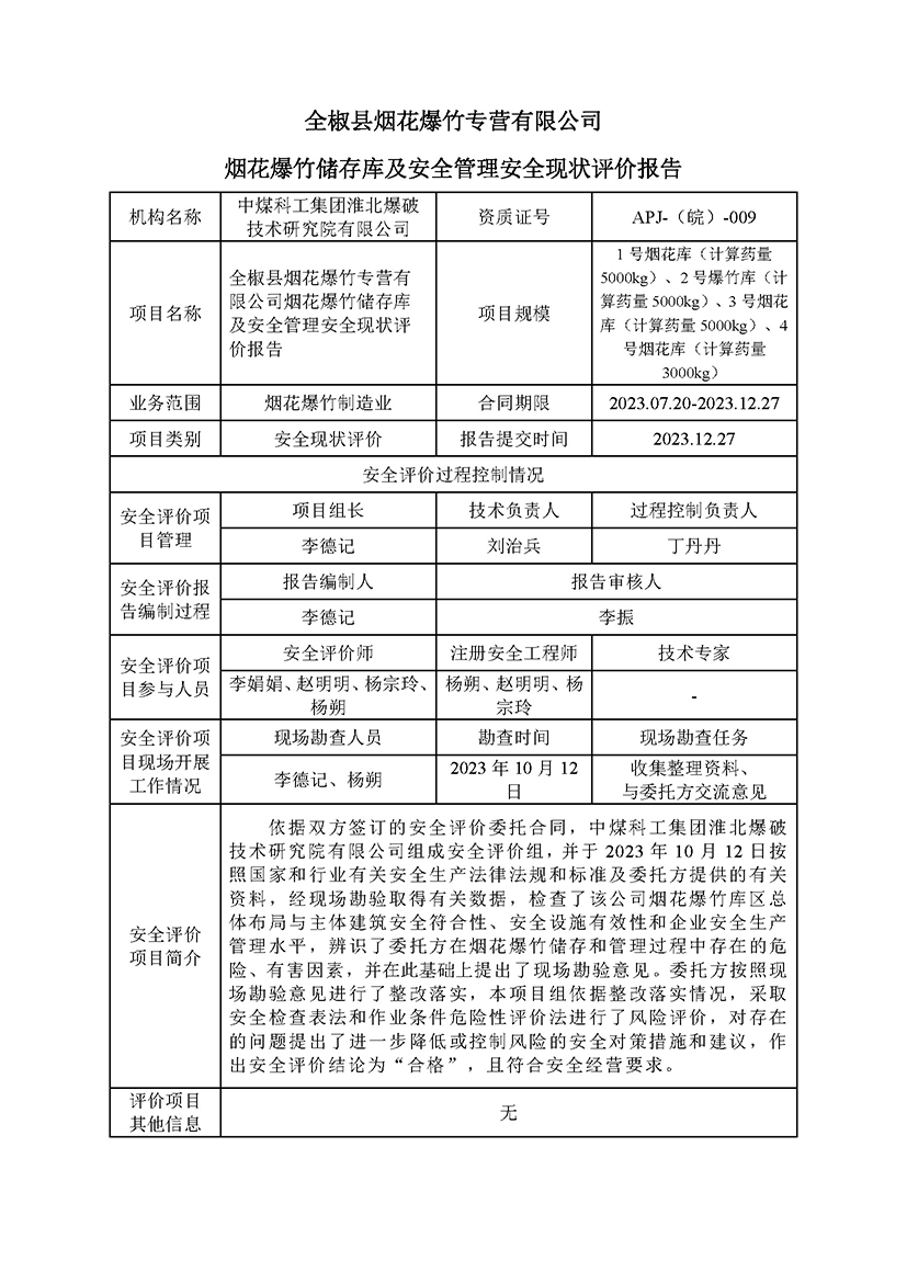 全椒縣煙花爆竹專營有限公司 煙花爆竹儲存庫及安全管理安全現(xiàn)狀評價