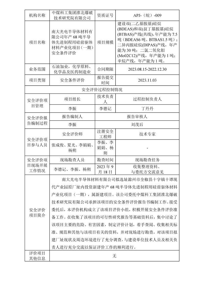南大光電半導(dǎo)體材料有限公司 年產(chǎn)68噸半導(dǎo)體先進制程用硅前驅(qū)體材料產(chǎn)業(yè)化項目(一期)安全條件評價