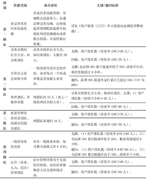 第一梯隊:側(cè)重現(xiàn)有話務(wù)科室間“技能協(xié)同”,適度放棄某些品牌,重點(diǎn)保障某品牌;同時一線班組長和日常負(fù)責(zé)業(yè)務(wù)知識管理的同事入線,承接普通話務(wù)。