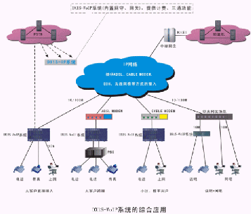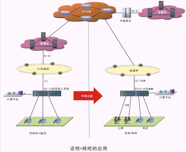 ·當(dāng)前,網(wǎng)吧如雨后春筍般地在快速建立,DX1S-VoIP系統(tǒng)向下提供10M LAN口及模擬電話接口,可利用已建設(shè)好的寬帶資源,同時(shí)架設(shè)IP超市及網(wǎng)吧,資源利用率高,成本低,收效快。