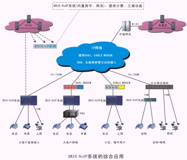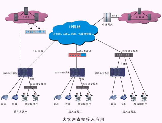 ·DX1S-VoIP系統(tǒng)可提供以太網(wǎng)、DDN、ADSL、無線網(wǎng)橋等多種接入方式,辦事處或分支機(jī)構(gòu)根據(jù)現(xiàn)有的條件可靈活選擇接入方式。