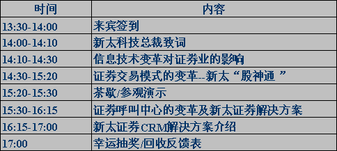 與高交會同期的還有10月15日下午在投資大廈4樓多功能廳舉行的新太“股神通”產(chǎn)品發(fā)布會暨證券業(yè)務(wù)解決方案研討會(詳細(xì)情況請看邀請函)。