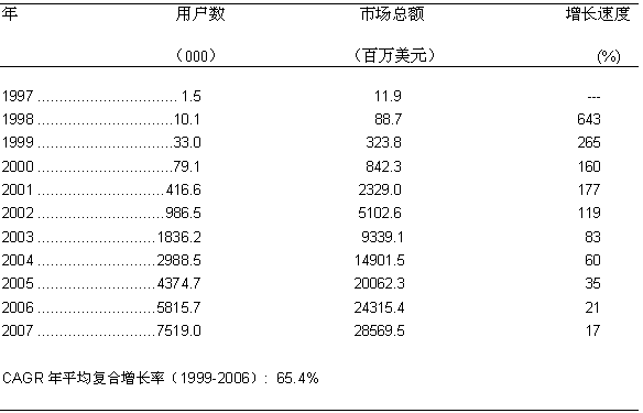 圖一: 美國寬帶無線固定接入市場的增長歷史和預測 1997-2007