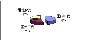 。5)向誰購買:鑒于國內(nèi)并沒有知名度很高的CRM實(shí)施廠商,而國外的著名廠商在國內(nèi)的品牌宣傳也不足,所以我們的調(diào)查表中只設(shè)了:國內(nèi)廠商、國外廠商和根據(jù)性價(jià)比進(jìn)行選擇三個(gè)項(xiàng)目,與購買能力對照,預(yù)期實(shí)施金額在100萬以下的企業(yè),一般側(cè)重國內(nèi)廠商,而實(shí)施金額在100萬以上企業(yè)則側(cè)重國外企業(yè)。