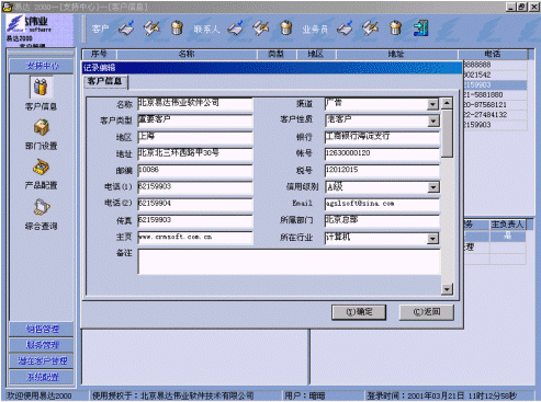 北京易達偉業(yè)軟件技術有限公司是由一群年輕的知識型創(chuàng)業(yè)者及投資機構共同投資創(chuàng)立的,正式成立于1999年10月,是國內較早進行CRM軟件專業(yè)研發(fā)和推廣的領導廠商之一。