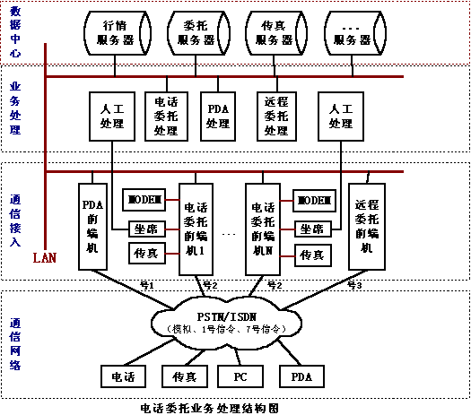 第一種方案是在證券營(yíng)業(yè)部加專用的前端機(jī)和處理機(jī),申請(qǐng)獨(dú)立的電話線路來(lái)處理PDA的委托,PDA和營(yíng)業(yè)部前端機(jī)采用雙向或單向的DTMF收發(fā)的方式完成通訊。根據(jù)市場(chǎng)的情況來(lái)看,這種方式不容易被證券營(yíng)業(yè)部和股民接受,證券營(yíng)業(yè)部要申請(qǐng)一定數(shù)量的電話線路,和證券電話委托的線路不能共用,增加了營(yíng)業(yè)部的費(fèi)用。由于線路的限制,股民在做委托查詢時(shí)往往出現(xiàn)線路阻塞等情況,另外DTMF通訊方式的有速度慢,信息容量有限,抗干擾性差等缺點(diǎn),股民不容易接受。目前東方潮公司的“東方獵人”的委托就是采用這種方式。