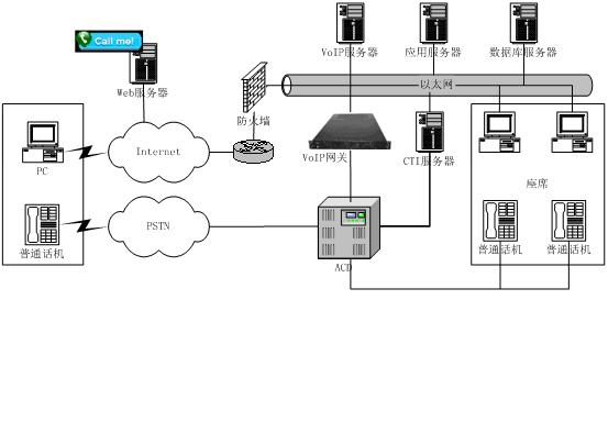 相對(duì)于傳統(tǒng)以PSTN網(wǎng)接入的呼叫中心,東進(jìn)互聯(lián)網(wǎng)呼叫中心增加了系統(tǒng)與Internet的接入,將原來(lái)由IVR完成的操作通過(guò)Web頁(yè)面上的流程實(shí)現(xiàn),這樣用戶通過(guò)下拉菜單、簡(jiǎn)單填寫(xiě)、點(diǎn)擊按鈕等操作完成客戶識(shí)別、業(yè)務(wù)識(shí)別等操作,這些流程完成后,通過(guò)VoIP對(duì)呼叫中心呼入,由呼叫中心對(duì)呼入進(jìn)行受理,再按照相應(yīng)的原則分配到座席,座席再作相應(yīng)的應(yīng)答和處理,從而為客戶提供了一個(gè)通過(guò)Web站點(diǎn)直接進(jìn)入呼叫中心的途徑,把Internet所具有的豐富信息資源和強(qiáng)大的功能賦予呼叫中心,它向客戶提供一個(gè)可訪問(wèn)的Web站點(diǎn),使得呼叫中心從“撥叫到交談(Dial