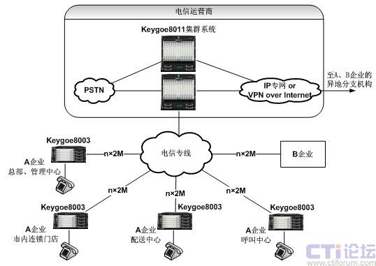 電信運(yùn)營商在核心機(jī)房部署由東進(jìn)Keygoe系列多媒體交換機(jī)組成的高性能集群交換機(jī)系統(tǒng),各個企業(yè)以及各企業(yè)的市內(nèi)分支機(jī)構(gòu)(如管理中心、連鎖門店、配送中心、呼叫中心等)分別配置東進(jìn)Keygoe系列多媒體交換機(jī),并通過電信運(yùn)營企業(yè)的2M專線(E1中繼)方式上聯(lián)到電信運(yùn)營商核心機(jī)房的交換機(jī)集群系統(tǒng),組成一個以集群交換機(jī)系統(tǒng)為核心的星形網(wǎng)絡(luò)(如上圖所示)。所有的市話呼入和呼出都通過核心節(jié)點和電信運(yùn)營商的中繼通道,為連鎖型商業(yè)企業(yè)提供內(nèi)部話音通訊的統(tǒng)一編號、統(tǒng)一撥號、統(tǒng)一維護(hù)和管理,企業(yè)對外公布統(tǒng)一和便于記憶的號碼,實現(xiàn)企業(yè)管理、營銷和客戶服務(wù)的統(tǒng)一化和規(guī)范化。核心機(jī)房的高性能集群交換機(jī)系統(tǒng)充分考慮冗余備份,如模塊和整機(jī)設(shè)備的雙冗余,從而提高整個通信平臺的高可用性和高可靠性。各個分支的多媒體交換機(jī)具備本地的獨立工作能力,即使在中繼線路出現(xiàn)故障的情況下,也能正常的工作。同時,Keygoe系列多媒體交換機(jī)集成了7號信令、會議、傳真、語音等豐富的多媒體處理資源,可以為用戶開發(fā)靈活多樣的智能業(yè)務(wù)和增值業(yè)務(wù),豐富了系統(tǒng)的應(yīng)用。