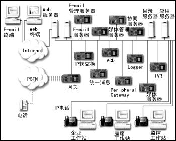 從上面的圖1、圖2中,可以看到IP通信大大簡(jiǎn)化了企業(yè)的網(wǎng)絡(luò)通信結(jié)構(gòu)。但是為了實(shí)現(xiàn)不同的功能和應(yīng)用,網(wǎng)絡(luò)中仍然存在很多的服務(wù)器,各個(gè)品牌不同功能的服務(wù)器之間的協(xié)同成為最顯著的問(wèn)題,同時(shí)維護(hù)和運(yùn)行這樣大量的設(shè)備也需要大量的資源支持。而且,這僅是單點(diǎn)的客戶服務(wù)中心所需的配備,而在基于IP通信的分布式客戶服務(wù)中心的構(gòu)建中,所涉及的設(shè)備更多。