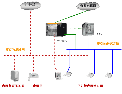 如果您的企業(yè)規(guī)模不是很大,原有的交換機(jī)投資不大,我們建議您用奧迪堅(jiān)的Altiserv來替代原有的交換機(jī)。當(dāng)然也可保留原有交換機(jī),將Altiserv作后端設(shè)備。