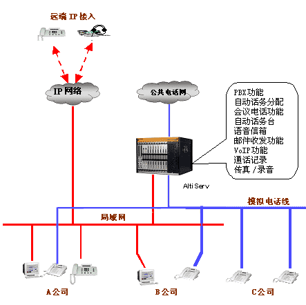 | 多個小型辦公室共享一個電話系統(tǒng)或局域網(wǎng)是一個比較經(jīng)濟選擇,現(xiàn)在很多辦公樓也是采用這種方式為大樓里的辦公室提供通訊或數(shù)據(jù)服務,大大減少了租戶的通訊的投資。但是采用傳統(tǒng)的交換機也帶來很多不便。如只能有一個總機,撥入的電話不知道是找哪個公司的,既增加接線員的工作,又不利樹立公司的形象。如何公平地向共用交換機的辦公室的收取電話費也是個解決不了的問題,因為無法記錄和統(tǒng)計每個辦公室的撥出的電話量。 但是采用奧迪堅的ALTISERV,這些問題很自然地就解決了。將每個辦公室設成一個工作組,每個工作組可以設置特定的撥入撥出電話市話號碼,對總機而言,來電時的桌面顯示公司名,或者通過多個自動話務臺直接轉(zhuǎn)入工作組。 對于撥出電話,只能通過事先設定電話進入市話網(wǎng)。這樣,這個電話的全部費用都由這個公司。 此外,共享的辦公室及其員工都可以使用ALTISERV提供的全部功能,就好象這個辦公室建了一個專門的網(wǎng)絡電話系統(tǒng)一樣。 接線圖如下: |