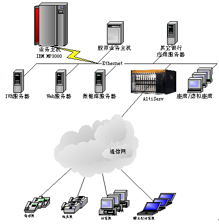 。。目標(biāo)是建立一個功能完善的客戶服務(wù)中心,涵蓋自動語音應(yīng)答(IVR)、人工座席、WEB呼叫、客戶資料查詢統(tǒng)計以及與現(xiàn)有的銀行其他業(yè)務(wù)系統(tǒng)的結(jié)合。整個系統(tǒng)采用奧迪堅呼叫中心系統(tǒng)AltiCenter,系統(tǒng)以一個特定號碼xxxxx作為呼叫中心的系統(tǒng)號碼(也可提供多個電話號碼),集中受理客戶的業(yè)務(wù)需求,為客戶提供綜合性服務(wù)。它能與Internet、資料庫系統(tǒng)很好地集成,實現(xiàn)資料共用和各種其他不同的業(yè)務(wù)功能。