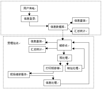 維修點(diǎn)對用戶的報(bào)修情況進(jìn)行預(yù)處理之后,根據(jù)用戶所在的區(qū)域,分配至最近距離的維修站,將用戶與其報(bào)修信息即時(shí)轉(zhuǎn)移,這也就是圖中所顯示的"轉(zhuǎn)站處理"。之后,維修站將直接打印出報(bào)修單,加快服務(wù)實(shí)施的效率、減少人工出錯的比例,有專業(yè)人員及時(shí)上門服務(wù)檢修。