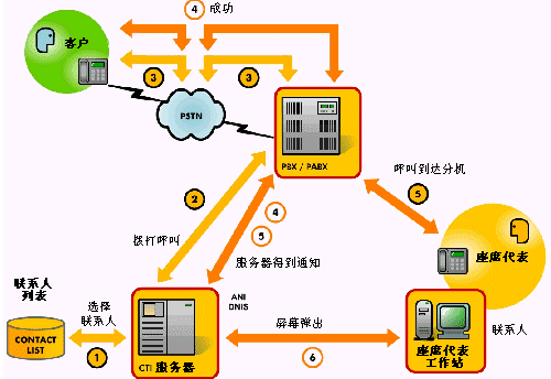 在“呼出”交互中,一個標準的客戶服務系統(tǒng)應該預裝有一個用于執(zhí)行的聯(lián)系人列表,然后自動生成呼叫并且將呼叫分配至可用的座席代表,如下圖所示: