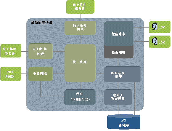 交互(輔助)服務器是客戶服務系統(tǒng)體系結(jié)構的主要組件,控制所有的客戶交互以及它們在座席代表間的分配。其主要功能是: