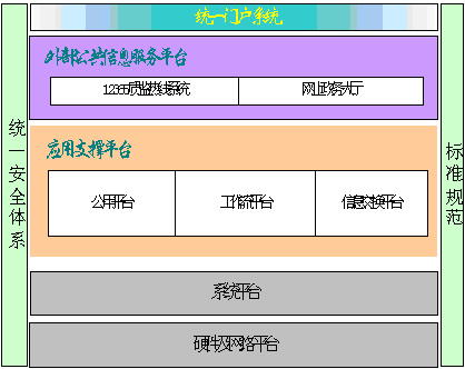 2 )系統(tǒng)基于 J2EE架構(gòu),采取三層結(jié)構(gòu)設(shè)計,分為前端應(yīng)用(外部公共信息服務(wù)平臺)、應(yīng)用支撐平臺和系統(tǒng)軟硬件平臺,以應(yīng)用支撐平臺為核心,以安全和標準為保證。
