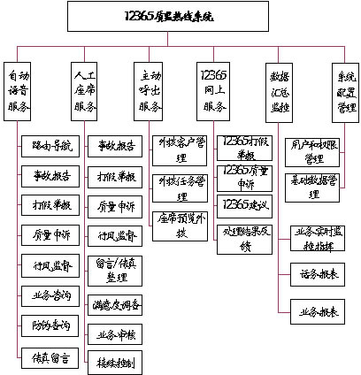 系統(tǒng)主要功能有:事故報告、打假舉報、質(zhì)量申訴、行風監(jiān)督、業(yè)務(wù)咨詢、防偽查詢、主動呼出、網(wǎng)上服務(wù)、統(tǒng)計分析、數(shù)據(jù)匯總監(jiān)控等。