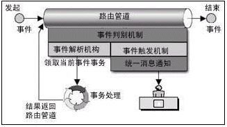 在路由管道中流轉(zhuǎn)著加載了業(yè)務(wù)的工作流事件。事件按照事先定義的路由規(guī)則流轉(zhuǎn),事件的路由規(guī)則定義了事件在路由管道中可以?康摹罢九_(tái)”,同時(shí)定義了事件到達(dá)“站臺(tái)”時(shí)可以領(lǐng)取并處理加載在事件上的業(yè)務(wù)的角色。事件從始發(fā)站臺(tái)進(jìn)入路由管道,經(jīng)過(guò)一個(gè)或多個(gè)中間站臺(tái),最后到達(dá)終點(diǎn)站。事件每停靠一個(gè)站臺(tái),相關(guān)人員領(lǐng)取事務(wù),并進(jìn)行處理后重新裝載事務(wù),觸發(fā)事件向下一個(gè)站臺(tái)流轉(zhuǎn),除非事件已經(jīng)到達(dá)終點(diǎn)站。