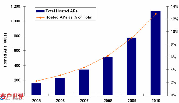根據(jù)datamonitor在2006年的分析,自2005年起,全球呼叫中心托管的總數(shù)約二十萬個(gè)座席,占全球呼叫中心的總座席數(shù)得2%,到2008年成長(zhǎng)到約五十萬個(gè)座席,占總量的6%左右,在2010年時(shí)更會(huì)成長(zhǎng)到超過一百萬個(gè)座席占總數(shù)的10%左右。所以整個(gè)托管市場(chǎng)來說將會(huì)持續(xù)不斷的成長(zhǎng)(見圖二)。