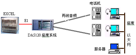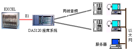 因?yàn)镋XCEL交換機(jī)不能提供模擬接口。DAS120的出現(xiàn)很好地彌補(bǔ)了其不足。它與EXCEL交換機(jī)采用4個(gè)E1連接,可以簡潔實(shí)現(xiàn)PCM信號轉(zhuǎn)模擬信號引出到座席。E1接口的信令可選配為隨路信令CAS和透明通道Clear
