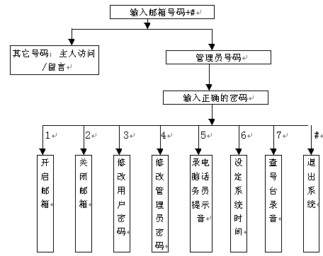 作為信箱主人的用戶既可以象其它普通用戶一樣進(jìn)行普通用戶訪問(wèn)(指訪問(wèn)其它分機(jī)、給其它分機(jī)主人留言等),還可以使用系統(tǒng)專(zhuān)門(mén)提供的主人訪問(wèn)服務(wù)功能。