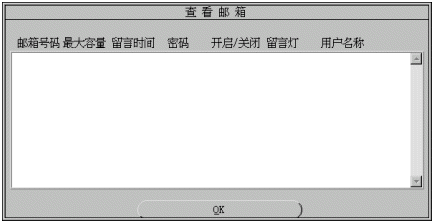 1). 您可修改的參數(shù)有:用戶名稱(chēng)、用戶密碼、信箱容量、最大留時(shí)長(zhǎng)、開(kāi)啟/關(guān)閉、點(diǎn)留言燈。有關(guān)參數(shù)的細(xì)節(jié)將在增加信箱一節(jié)中介紹。