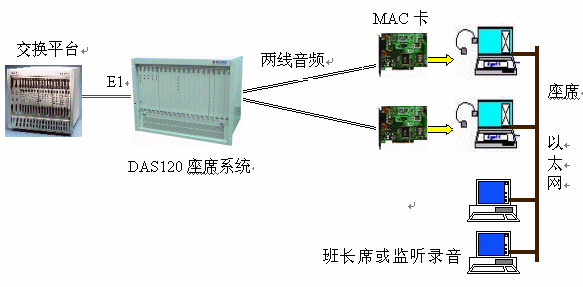 DAS120與億景座席卡MAC配合使用,可使系統(tǒng)的優(yōu)越性發(fā)揮到最大。MAC卡提供的強(qiáng)大功能(收發(fā)DTMF和450HZ信號(hào)音,語(yǔ)音錄放等)有效地簡(jiǎn)化系統(tǒng)軟件的設(shè)計(jì),并可降低系統(tǒng)成本,如EXCEL交換平臺(tái)可不用配置DSP卡,IVR可簡(jiǎn)化等。還可以有效地降低交換平臺(tái)的處理負(fù)荷,提高話務(wù)處理能力。