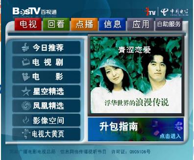 上海IPTV點(diǎn)播節(jié)目達(dá)3000小時(shí),包括電影、電視劇、音樂(lè)娛樂(lè)、紀(jì)實(shí)節(jié)目、少兒、體育以及教育等欄目。點(diǎn)播節(jié)目改變了“你播我看”的電視被動(dòng)接受方式,讓用戶可以根據(jù)自己的喜好來(lái)選擇喜愛(ài)的個(gè)性化節(jié)目,大大提高了用戶的喜愛(ài)度。值得一提的是,當(dāng)收看電影中途退出的時(shí)候,系統(tǒng)提供了“書簽”功能,下一次收看時(shí),便可以從書簽處繼續(xù),方便用戶使用和體驗(yàn)。另外,系統(tǒng)提供的“搜索”功能也讓百姓眼前一亮,尋找自己喜愛(ài)的影片就更方便了。