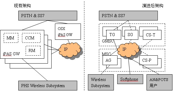 GW軟件改造而來,只需新增CS-P即可?偟膩碚f,核心網的演進只是增加CS-P、擴容CS-T、原有的iPAS GW軟件升級為TG/AG,就可以建立其一個具有多種終端接入能力的開放性多媒體VoIP移動軟交換網絡,而原有的PHS系統(tǒng)功能又不會受到影響。
