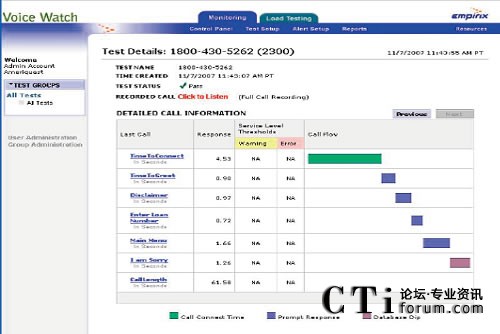 Voice Watch® 是一種主動(dòng)的客戶體驗(yàn)管理解決方案,它從呼叫者的角度來監(jiān)測(cè)端到端語音業(yè)務(wù)和系統(tǒng)設(shè)施的性能–從PSTN接入,通過IVR,轉(zhuǎn)接到人工坐席。Voice Watch發(fā)起有規(guī)律的周期性呼叫測(cè)量承載網(wǎng)的性能、主機(jī)和數(shù)據(jù)庫(kù)的響應(yīng)時(shí)間、語音提示的正確性、動(dòng)態(tài)數(shù)據(jù)的準(zhǔn)確度、通話質(zhì)量、呼叫路由、排隊(duì)時(shí)間、屏幕彈出窗口的正確性和及時(shí)性。一旦檢測(cè)到新問題,Voice Watch立即向相關(guān)的技術(shù)人員發(fā)出告警,并報(bào)告性能問題發(fā)生的位置和類型。此外,每一個(gè)監(jiān)測(cè)電話的性能指標(biāo),包括失效事件的語音記錄,可以立即被發(fā)布到Web上以便用戶能夠診斷和修復(fù)緊急問題。用戶還可以使用這個(gè)系統(tǒng)自動(dòng)生成匯總的管理報(bào)告和詳細(xì)的技術(shù)報(bào)告,可以和性能基準(zhǔn)和性能問題相比對(duì),并且有助于把握時(shí)機(jī)持續(xù)改善性能。