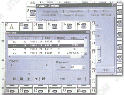 每個(gè)電話通道都有自動(dòng)增益(AGC)功能,可解決長(zhǎng)途電話、國(guó)際電話、或偏遠(yuǎn)地區(qū)電話信號(hào)不良等問(wèn)題。采用數(shù)字化錄音有效避免了傳統(tǒng)磁帶式錄音易失真、難保存的缺點(diǎn)。先進(jìn)的錄音系統(tǒng)設(shè)計(jì),使通話雙方覺(jué)察不到正在錄音或監(jiān)聽(tīng)。 錄音文件為.VOC格式,同時(shí)也可隨意的向前、向后的移動(dòng)。 |