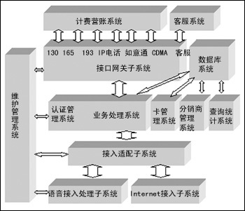 綜合付費(fèi)平臺(tái)的軟件邏輯結(jié)構(gòu)分為語(yǔ)音接入處理子系統(tǒng)、Internet 接入子系統(tǒng)、接入適配網(wǎng)關(guān)子系統(tǒng)、認(rèn)證管理子系統(tǒng)、業(yè)務(wù)處理系統(tǒng)、卡管理系統(tǒng)、分銷(xiāo)商管理系統(tǒng)、查詢(xún)統(tǒng)計(jì)系統(tǒng)、數(shù)據(jù)庫(kù)系統(tǒng)、接口網(wǎng)關(guān)子系統(tǒng)和維護(hù)管理子系統(tǒng)。
