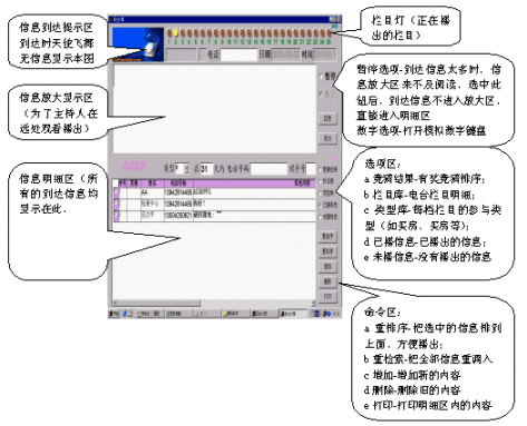 如果信息到達量過大,會導(dǎo)致信息放大區(qū)中的信息不斷被更新,此時,只要選中暫停選項,信息放大區(qū)的信息就不會被更新。該信息播出后,如果需要播出明細區(qū)中的內(nèi)容,只要在明細區(qū)中用鼠標左鍵雙擊該信息的信息內(nèi)容,該信息內(nèi)容立即上升到放大區(qū)中,同時該信息發(fā)送人的姓名、性別、電話、日期、時間會同時上升到放大區(qū)上方,而且該信息內(nèi)容會自動轉(zhuǎn)移到已播出信息中(這樣可以迅速明細區(qū)中的信息減少,方便主持人播出其他信息)。