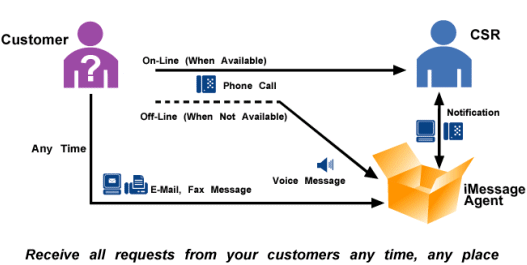 iMessage Agent可與您已有的ACD系統(tǒng)集成,當(dāng)目標(biāo)CSR不在時(shí)電話(huà)系統(tǒng)就將呼叫交付給iMessage Agent,iMessage Agent接到呼叫之后將對(duì)呼叫方進(jìn)行合適的問(wèn)候,再將消息存儲(chǔ)在郵件服務(wù)器中。根據(jù)預(yù)定義的規(guī)則,消息會(huì)被隨后路由到正確的消息框中。