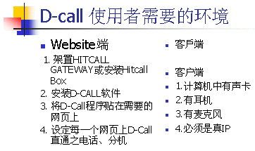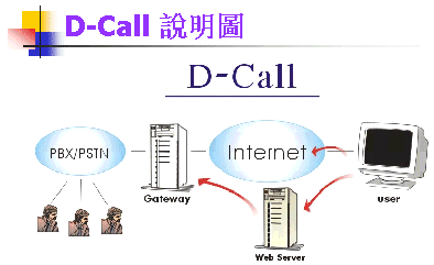 D-CALL指的是”Direct Call on Web”,提供電子商務(wù)中客戶與企業(yè)間網(wǎng)上實(shí)現(xiàn)網(wǎng)上實(shí)時(shí)語音互動(dòng)平臺。