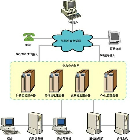 2) 與169多媒體信息平臺通過網(wǎng)關(guān)互聯(lián),最大限度實現(xiàn)數(shù)據(jù)共享,并且證券公司營業(yè)部可通過一條DDN完成電話委托和網(wǎng)上交易的業(yè)務(wù),大大降低證券公司日常運(yùn)營費(fèi)用,同時能最大限度地吸引異地、鄉(xiāng)鎮(zhèn)用戶。