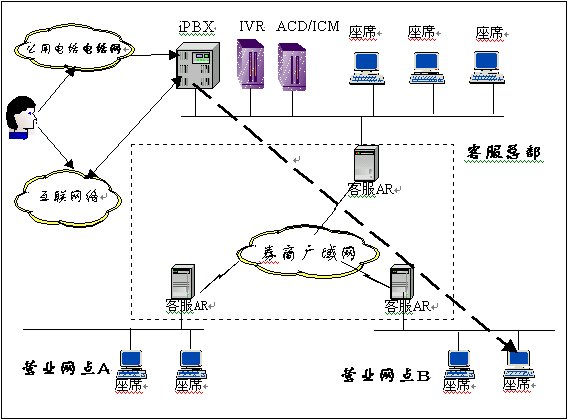 所有人工業(yè)務請求由總部的ACD根據(jù)客戶的開戶營業(yè)網(wǎng)點等屬性將話務分配給具有相應服務技能和營業(yè)網(wǎng)點的本地或遠端座席上。