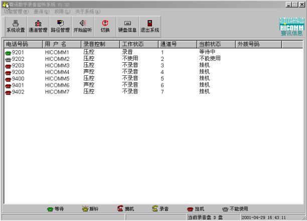 系統(tǒng)管理員可以方便地對所錄音的電話進行管理,譬如設定每一條線路的電話號碼、使用者、是否錄音,錄音的方式等。