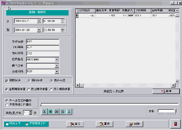 系統(tǒng)管理員可以對任一時間、任一電話的錄音進行查詢。系統(tǒng)對每一次錄音都詳細記載了通話開始時間、結(jié)束時間、主叫或被叫號碼、通話的線路等,當系統(tǒng)管理員在選中了某一條錄音后,可以進行即時播放。