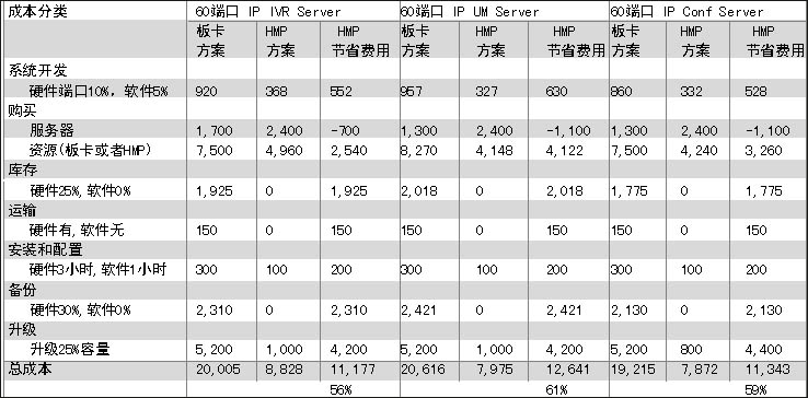 在眾多好處當(dāng)中,對用戶最有吸引力的無疑是節(jié)省成本。張怡國特別強調(diào),對一個應(yīng)用系統(tǒng)而言,成本的計算不應(yīng)該單以產(chǎn)品端口購買價格考核,而應(yīng)該是系統(tǒng)總的建設(shè)成本,包括產(chǎn)品購買成本、服務(wù)器成本、運輸、安裝、庫存、升級等多項費用;贖MP1.1版本,張怡國作了一個比較,以60端口IP IVR 60、端口IP UM或者60路會議為例,和語音板卡處理方式相比,基于HMP軟件實現(xiàn)能有近60%的成本節(jié)省,其中采購能節(jié)省20%,庫存節(jié)省20%,備份節(jié)省20%,升級節(jié)省近40%。