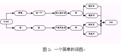 在語(yǔ)音識(shí)別中,語(yǔ)言模型是用來(lái)指導(dǎo)引擎進(jìn)行語(yǔ)音識(shí)別的,它限定了一個(gè)識(shí)別引擎所能表達(dá)的語(yǔ)句類(lèi)型。在我們常用的圖搜索引擎中,語(yǔ)言模型是通過(guò)語(yǔ)法來(lái)表示的,語(yǔ)法是由一系列表示某個(gè)領(lǐng)域的語(yǔ)言表達(dá)方式的規(guī)則組成的(語(yǔ)法的具體書(shū)寫(xiě)規(guī)則見(jiàn)引擎使用說(shuō)明書(shū))。這些規(guī)則會(huì)被被轉(zhuǎn)換成詞圖的形式然后用來(lái)指導(dǎo)語(yǔ)音的識(shí)別。所謂的詞圖是指由詞作為節(jié)點(diǎn)的一個(gè)圖,從該圖的開(kāi)始節(jié)點(diǎn)到末尾節(jié)點(diǎn)的任一條路徑都是一個(gè)有效合法的句子。圖2給出了一個(gè)簡(jiǎn)單的詞圖。