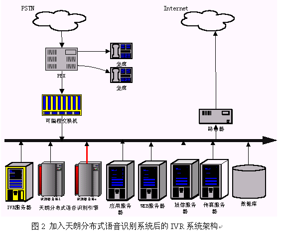 硬件連接:天朗分布式語(yǔ)音識(shí)別系統(tǒng)是通過(guò)局域網(wǎng)來(lái)把客戶端和服務(wù)器連在一起。因此在硬件上把天朗分布式語(yǔ)音識(shí)別系統(tǒng)聯(lián)入到IVR的一種簡(jiǎn)單的辦法是把引擎的所有服務(wù)器接入到系統(tǒng)現(xiàn)有的局域網(wǎng)中,使得識(shí)別服務(wù)器能和IVR服務(wù)器通過(guò)TCP/IP通訊即可。連接后的系統(tǒng)架構(gòu)可以用圖2來(lái)表示。