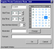 TeleConference系統(tǒng)內(nèi)的任一個分機,都可以利用瀏覽器(Internet Browser)來預(yù)約會議時間,而參加會議的人可以在會議開始時,自動打電話進系統(tǒng)參加會議就像加入“聊天室“一樣簡單。