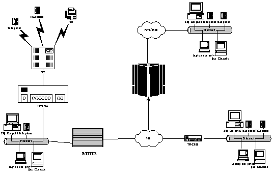 該應(yīng)用示意圖具有一個(gè)(iPBX )或多個(gè)辦公場地(nIPBX - 組網(wǎng)iPBX )提供電話系統(tǒng)解決方案。該解決方案是基于IP 電話技術(shù)而構(gòu)建的Tw-IPBX “一體化概念”,同時(shí)可提供傳統(tǒng)的模擬電話概念,如模擬電話和傳真機(jī)。以下敘述了客戶機(jī)組合的單獨(dú)應(yīng)用場景,包括: